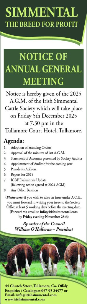 Notice is hereby given of the 2025 A.G.M. of the Irish Simmental Cattle Society which will take place Friday 5th December 2025 at 7.30 pm in the Tullamore Court Hotel, Tullamore, Co. Offaly. R35 D406