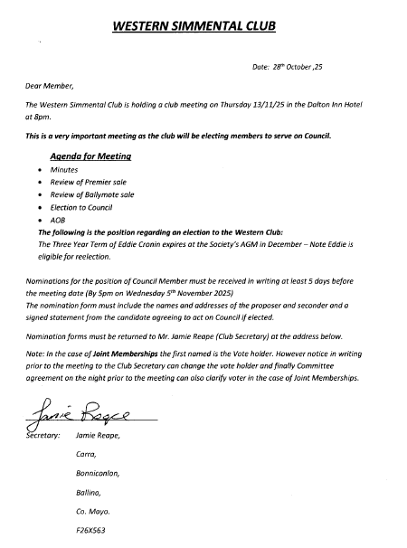 WESTERN SIMMENTAL CLUB MEETING THURSDAY 13TH NOVEMBER 2025 Read more articles Previous PostCatalogue here for Ballymote X Heifer Sale Saturday 04th October 2025 Leave a Reply Cancel replyCommentEnter your name or username to comment Enter your email address to comment Enter your website URL (optional) Save my name, email, and website in this browser for the next time I comment.